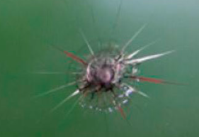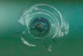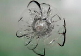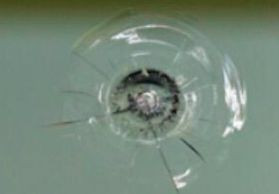 El impacto rompe el vidrio exterior y se forma una especie de circulo estrella con muchas puntas o una grieta en forma de línea.